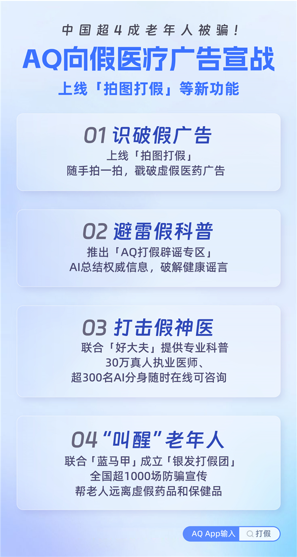 对于老年人群体在面对虚假医疗信息时的脆弱性,AQ联合蓝马甲公益组织成立“银发打假团”,将在全国各地开展超1000场老人防骗宣传活动,帮老人守好养老钱,远离虚假医药和保健品的伤害。
