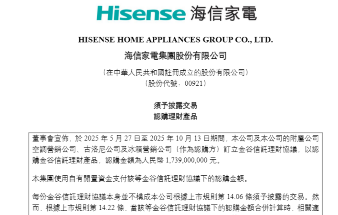 近日,《金融时报》记者关注到,“家电巨头”海信家电宣布,于2025年5月27日至2025年10月13日期间,公司及公司的附属公司空调营销公司、古洛尼公司及冰箱营销公司(作为认购方)订立金谷信托理财协议,以认购金谷信托理财产品,认购金额为人民币17.39亿元。